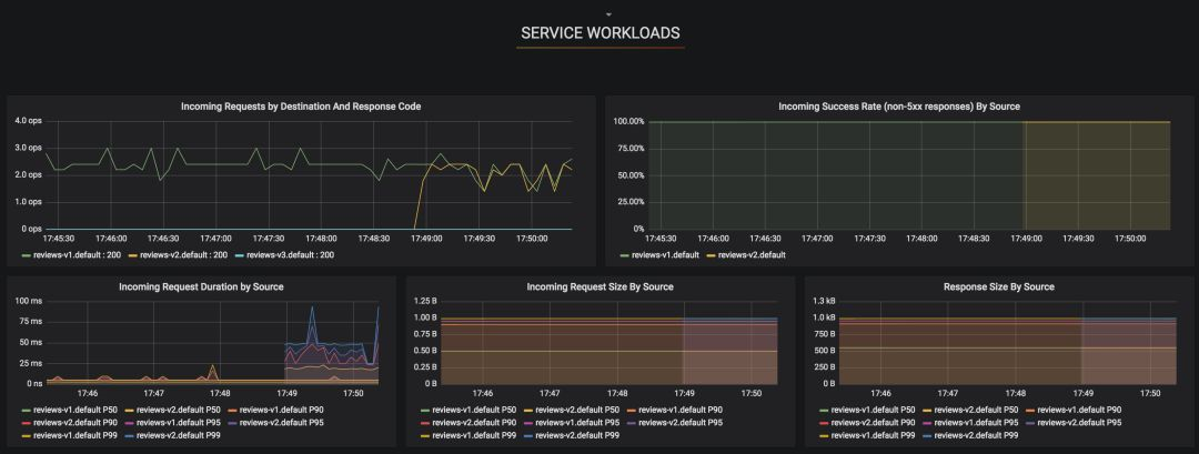 如果你滚动面板,在SERVICE WORKLOADS下你将看到Incoming Requests by Destination And Response Code的图表,它要求Reviews应用程序只在v1端点结束。如果你使用以下命令,生成对版本2的应用的请求(请记得用户jason可以访问版本2的reviews 应用):