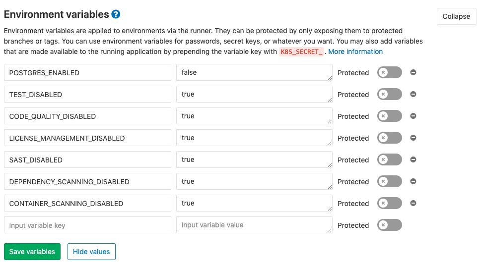 在项目页面左侧的菜单窗格中,选择“设置”>“CI / CD”。展开“ 环境变量”部分,并设置以下变量:
