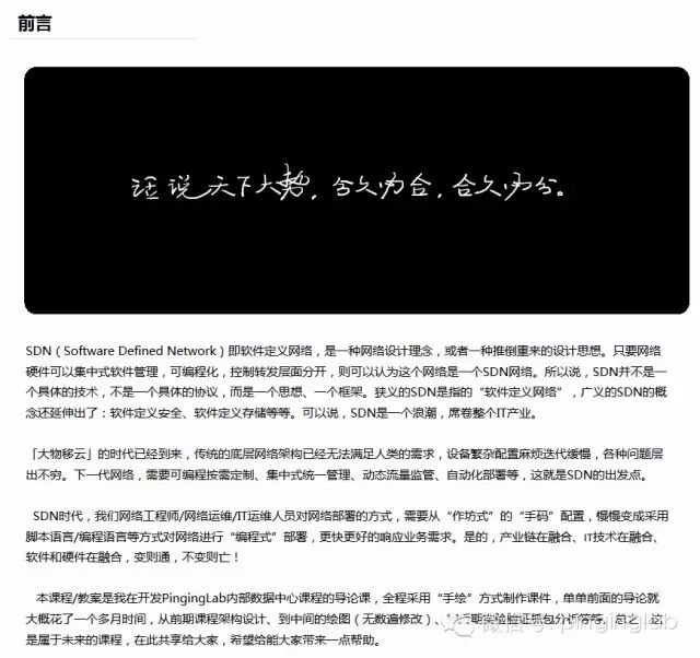 本课程/教案(发布在51CTO学院)是我在开发PingingLab内部数据中心课程的导论课,全程采用“手绘”方式制作课件,单单前面的导论就大概花了一个多月时间,从前期课程架构设计、到中间的绘图(无数遍修改)、到后期实验验证抓包分析等等。总之,这是属于未来的课程,在此共享给大家,希望给能大家带来一点帮助。