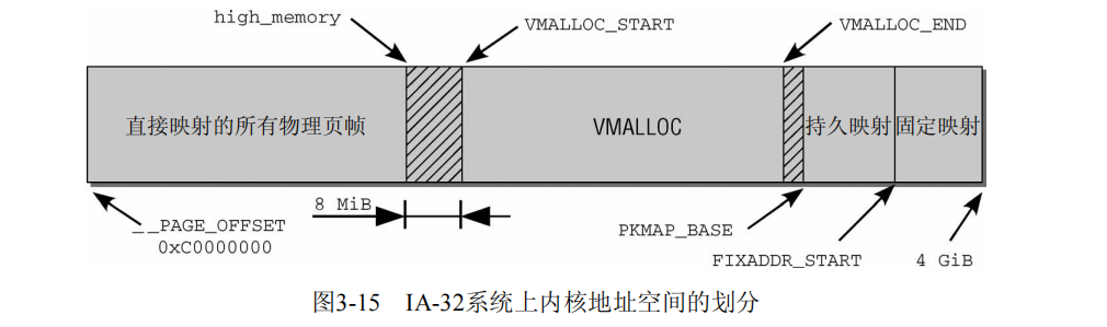地址空间的第一段用于将系统的所有物理内存页映射到内核的虚拟地址空间中。由于内核地址空间从偏移量0xC0000000开始,即经常提到的3 GiB,每个虚拟地址x都对应于物理地址x—0xC0000000,