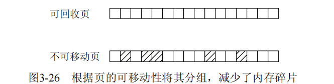 页的可移动性,依赖该页属于3种类别的哪一种。内核使用的反碎片技术,即基于将具有相同可移动性的页分组的思想。为什么这种方法有助于减少碎片?回想图3-25中,由于页无法移动,导致在