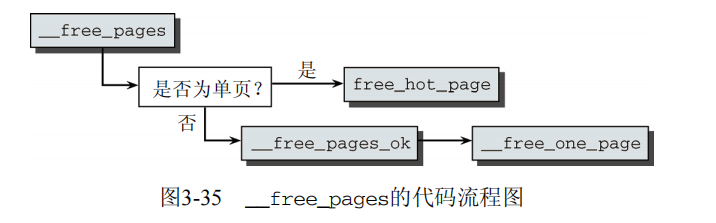 __free_pages是一个基础函数,用于实现内核API中所有涉及内存释放的函数。其代码流程图如图3-35所示。