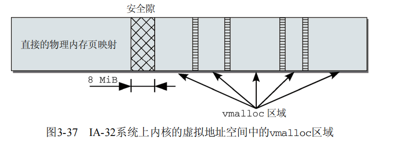 如图3-37所示,在IA-32系统中,紧随直接映射的前892 MiB物理内存,在插入的8 MiB安全隙之后,是一个用于管理不连续内存的区域。这一段具有线性地址空间的所有性质。分配到其中的页可能位于物理内存中的任何地方。通过修改负责该区域的内核页表,即可做到这一点。相关的描述请见6.内核地址空间的划分
