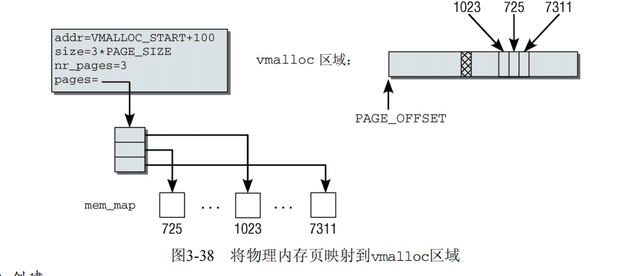 图3-38给出了该结构使用方式的一个实例。其中依次映射了3个(假想的)物理内存页,在物理内存中的位置分别是1 023、725和7 311。在虚拟的vmalloc区域中,内核将其看作起始于VMALLOC_START+ 100的一个连续内存区。