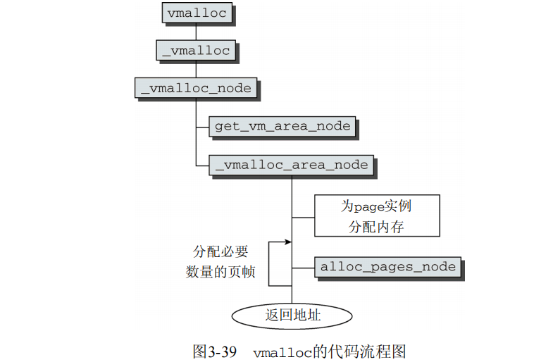 vmalloc发起对不连续的内存区的分配操作。该函数只是一个前端,为__vmalloc提供适当的参数,后者直接调用__vmalloc_node。相关的代码流程图见图3-39。
