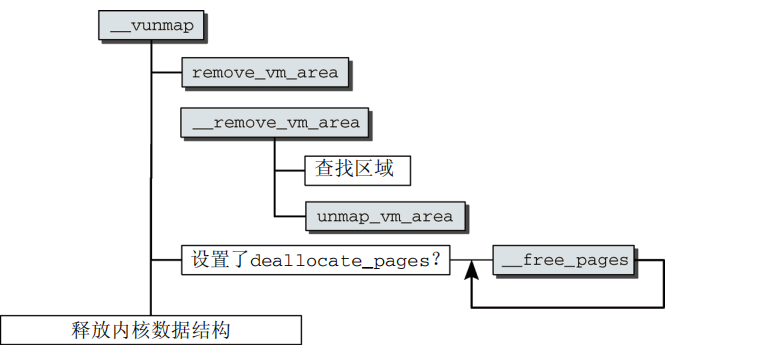 addr表示要释放的区域的起始地址,deallocate_pages指定了是否将与该区域相关的物理内存页返回给伙伴系统。vfree将后一个参数设置为1,而vunmap设置为0,因为在这种情况下只删除映射,而不将相关的物理内存页返回给伙伴系统。图3-40给出了__vunmap的代码流程图。