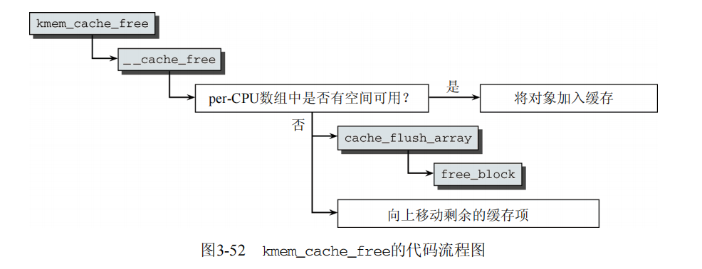 如果一个分配的对象已经不再需要,那么必须使用kmem_cache_free返回给slab分配器。图3-52给出了该函数的代码流程图。