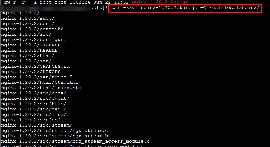 2.解压安装包并指定位置:tar -zxvf nginx-1.20.2.tar.gz -C /usr/local/nginx/