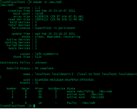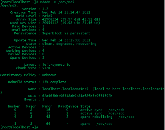 [root@localhost ~]# mdadm -Cv /dev/md5 -l5 -n3 /dev/sdb /dev/sdc /dev/sdd --spare-devices=1 /dev/sde mdadm: layout defaults to left-symmetric mdadm: layout defaults to left-symmetric mdadm: chunk size defaults to 512K mdadm: size set to 20954112K mdadm: Fail create md5 when using /sys/module/md_mod/parameters/new_array mdadm: Defaulting to version 1.2 metadata mdadm: array /dev/md5 started.