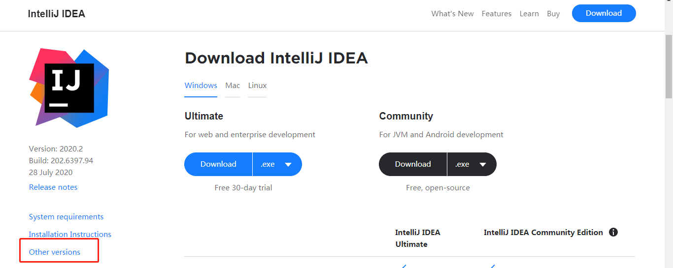 安装包可以到https://www.jetbrains.com/idea/download/下载,默认下载最新版本,可以选择以往适合自己和对应的操作版本系统进行下载。