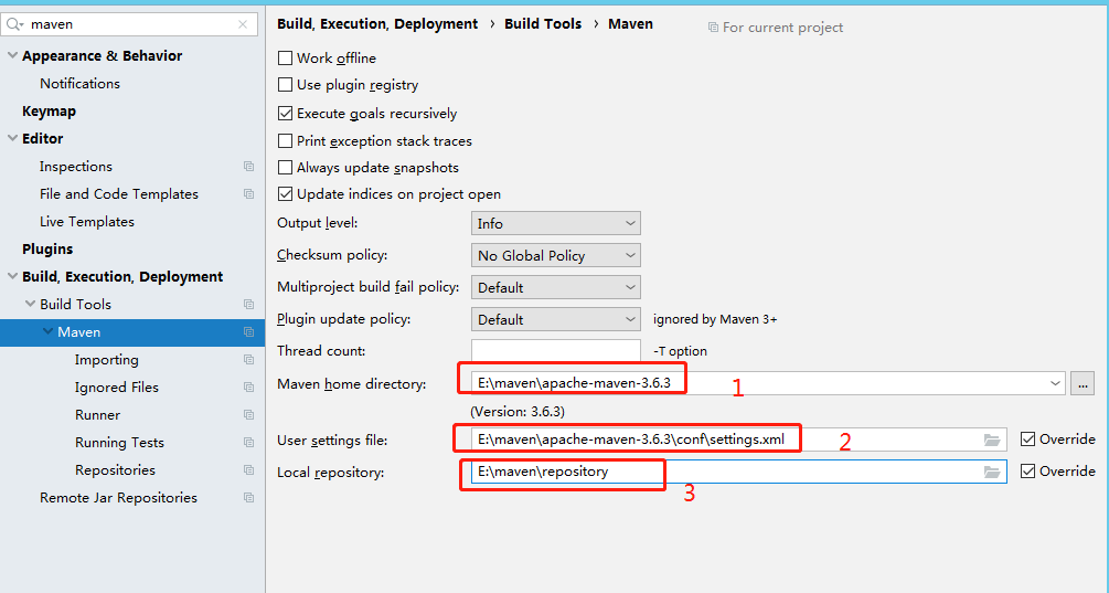 2.将图中红框中标识的”1“,”2“,”3“,分别填写成,maven安装家目录,maven的settings.xml配置文件,和maven的本第仓库。