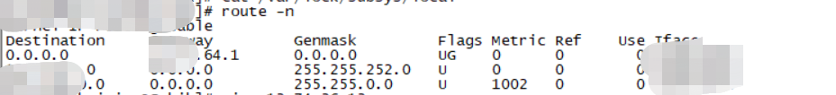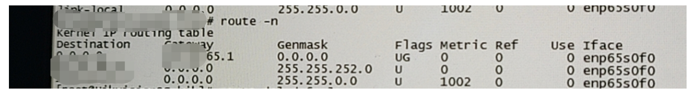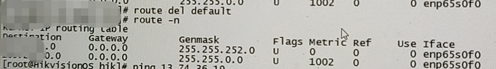 2.服务器上执行route -n命令查看路由表。可以发现。默认路由设置,从65.1网关做转发,但是其实交换机上没有配置65.1,应该从64.1做转发。