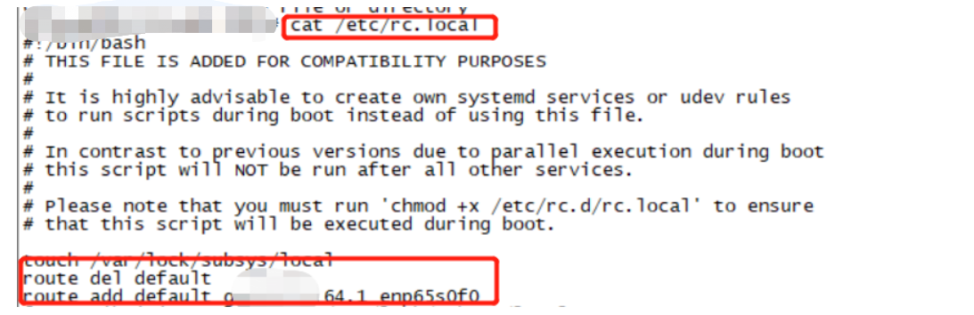 6.但是如此操作后,重启服务器后,就会出现默认路由恢复初始状态,这里我们只需将上面两个命令,粘贴到服务器/etc/rc.local文件中。如下所示