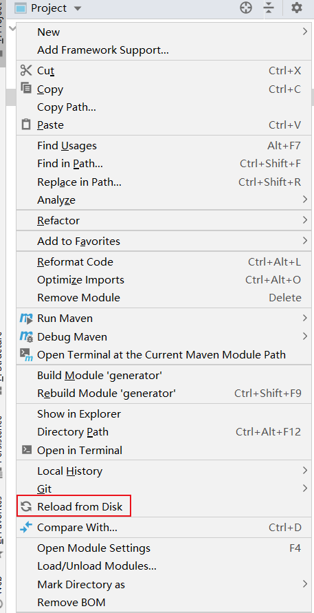 然后在idea软件里右击项目栏空白处,在菜单中选择Reload from Disk
