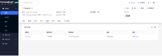 Inceptor 的多租户管理体系基于 Transwarp Guardian 服务实现,因此在创建/管理租户前需要已经安装完成Guardian服务,并且quark服务已启用插件,如下所示: