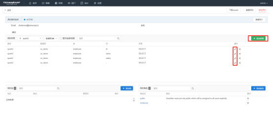 该方式可以直接在Guardian上进行配置,但是需要注意的是,Guardian界面更适合进行库、表、列的赋权,行权限需参考方式一采用SQL赋权。