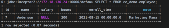 -- 赋表级权限 GRANT SELECT ON ce_demo.employee TO USER Anderson; -- 切换Anderson,执行下方语句验证 SELECT * FROM ce_demo.employee; //返回全部表信息