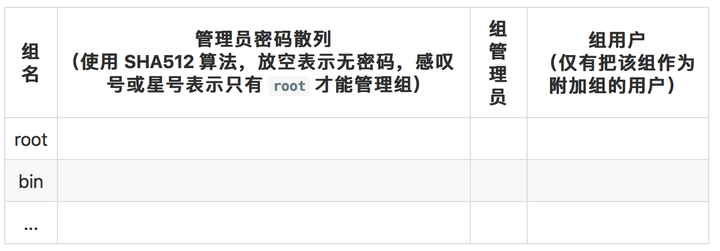 在早期的 Linux 系统中,组管理员密码是保存在这个文件里的。但是该文件默认所有用户都可读,会对系统安全造成威胁。现在,密码都以散列的形式存储在了 /etc/gshadow 中了。