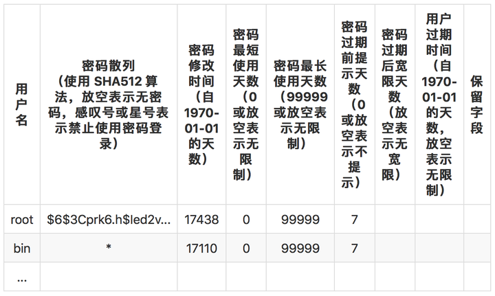 该文件同样以 : 作为字段分隔符,保存了本机所有用户有关密码以及安全的信息。以下详细说明其含义。