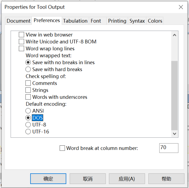 右键点击出错信息窗口,在弹出菜单中选择Properties。在弹出的窗口中选择Preferences标签页。滚动到窗口的最下部分,将Default encoding选择为DOS,选择确定。