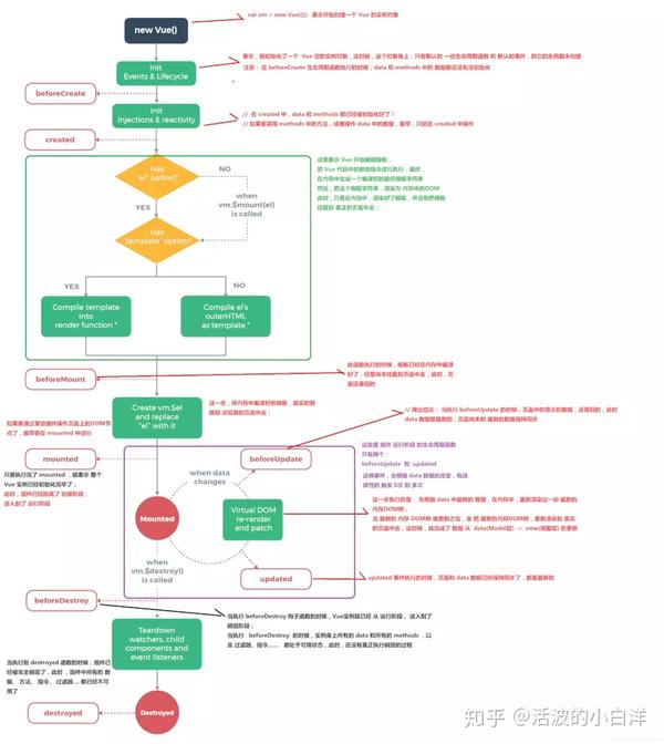 在钩子函数 mounted 被调用前,Vue 已经将编译好的模板挂载到页面上,所以在 mounted 中可以访问操作 DOM。vue 具体的生命周期示意图可以参见如下,理解了整个生命周期各个阶段的操作,关于生命周期相关的面试题就难不倒你了。