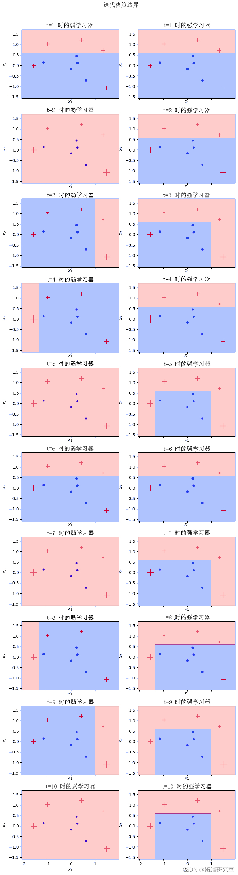 """ 在每个迭代中绘制出弱学习者和累积强学习者。 """