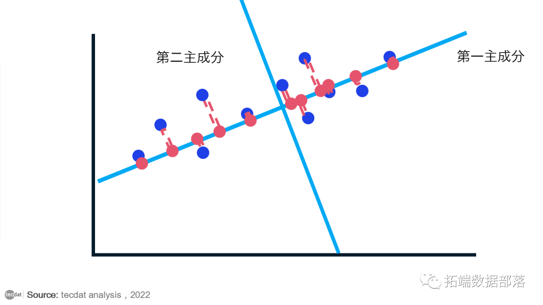 我们称这条线为我们的第一个主成分。自然,线上的点仍然比原始 2D 空间中的点更接近,因为您正在失去区分它们的维度。但在很多情况下,通过降维实现的简化超过了信息的损失,损失可以部分或全部重构。