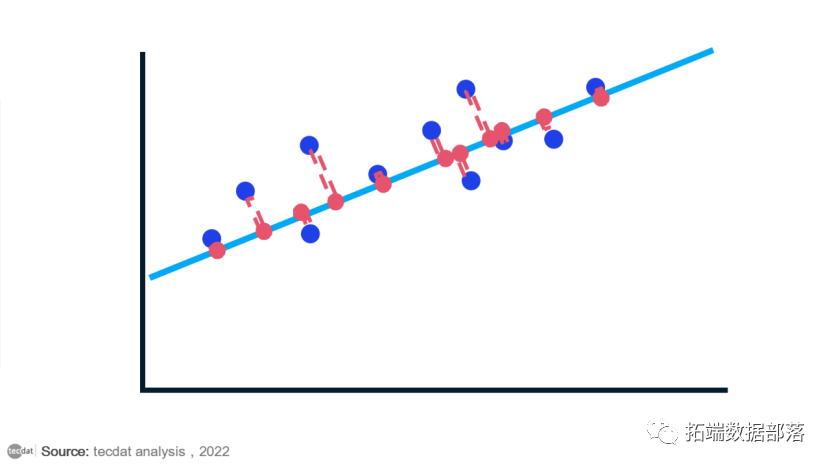 假设蓝色线将是我们的新维度。如果你看到蓝线(连接红点在蓝线上的投影),即每个数据点与直线的垂直距离就是投影误差。所有数据点的误差之和将是总投影误差。