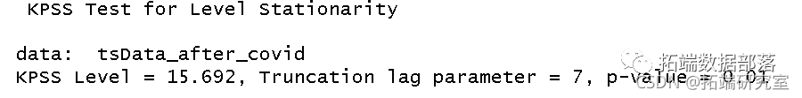 对于COVID-19之后的数据集,KPSS测试给出的p值为 0.01,该值小于0.05,这说明时间序列数据 不是平稳的。