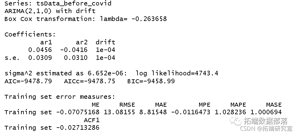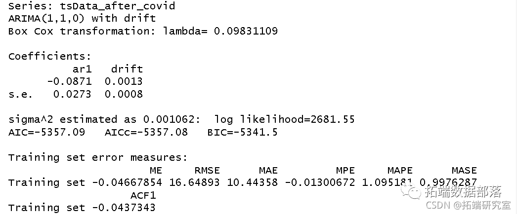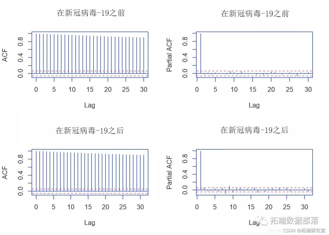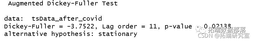 对于COVID-19之后的数据集,ADF测试给出的p值为0.01974,该值 小于0.05,这说明时间序列数据是 平稳的。