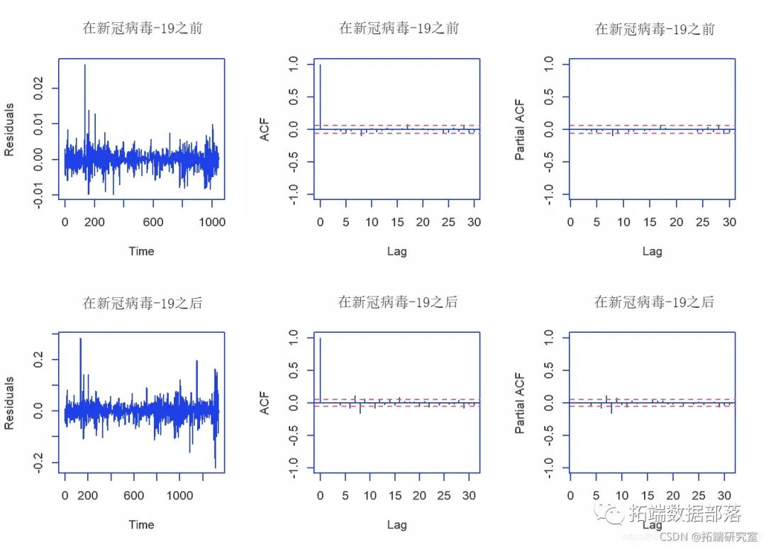 par(mfrow = c(2,3)) plot(before_covidresiduals) plot(mfter_covidresiduals)