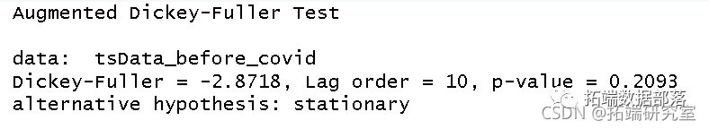 对于COVID-19之前的数据集,ADF测试给出的p值为 0.2093,该值大于0.05,因此说明时间序列数据 不是平稳的。