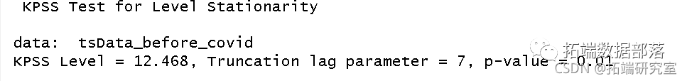 对于COVID-19之前的数据集,KPSS测试得出的p值为 0.01,该值小于0.05,因此说明时间序列数据 不是平稳的。