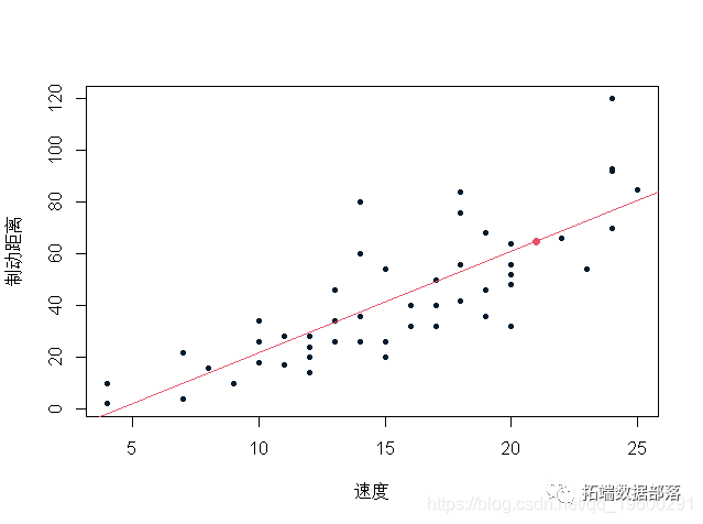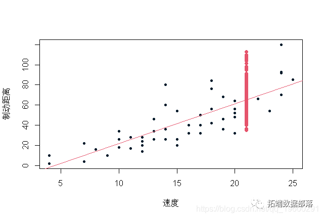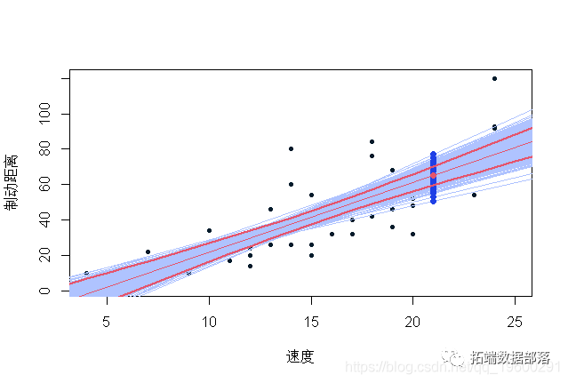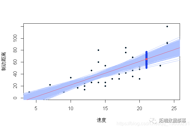 + points(x,predict(reg,newdata=data.frame(speed=x)),pch=19,col="blue")