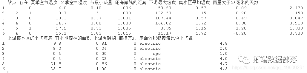 有两套短鳍鳗的记录数据。一个用于模型训练(建立),一个用于模型测试(评估)。在下面的例子中,我们加载的是训练数据。存在(1)和不存在(0)被记录在第2列。环境变量在第3至14列。