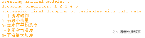 简化会建立了许多模型,所以它可能很慢。在其中,我们评估了简化lr为0.005的模型的价值,但只测试剔除最多5个变量("n.drop "参数;默认是自动规则一直持续到预测偏差的平均变化超过gbm.step中计算的原始标准误差)。