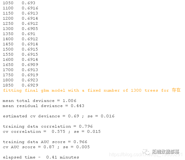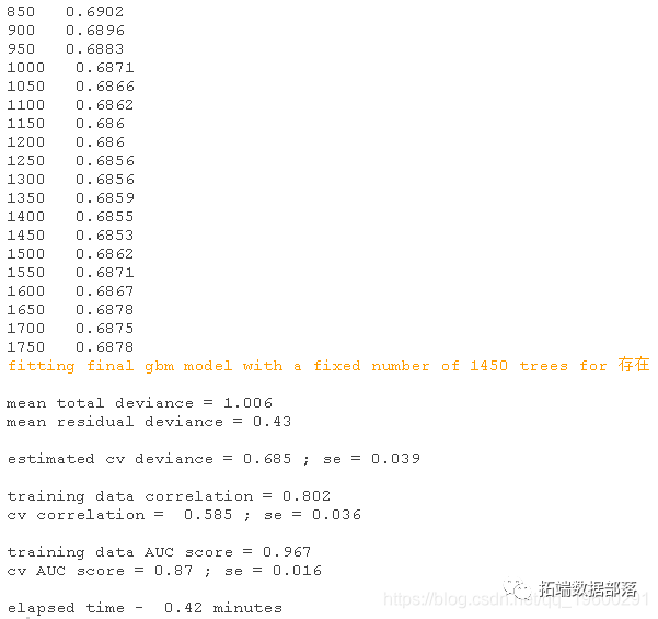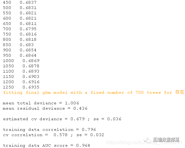以上是对设置的初步猜测,使用了Elith等人(2008)中讨论的经验法则。它做出的模型只有650棵树,所以我们的下一步将是减少lr。例如,尝试lr = 0.005,争取超过1000棵树。