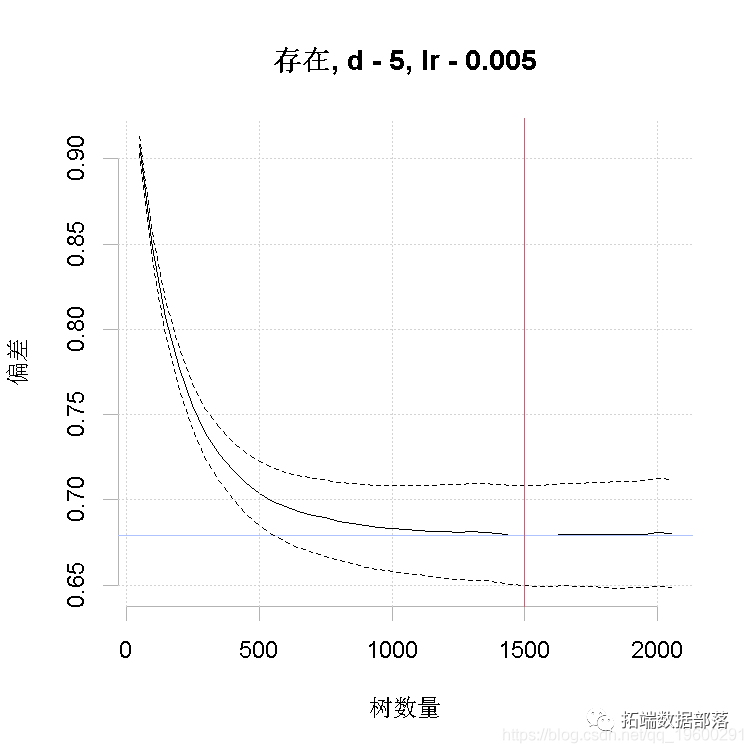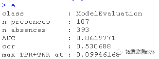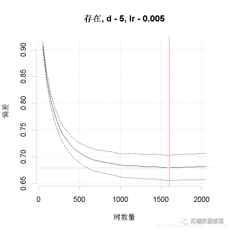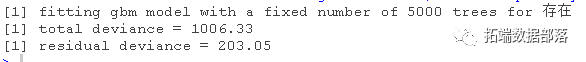 上面我们使用了交叉验证的。我们定义了:数据;预测变量;因变量--表示物种数据的列号;树的复杂度--我们首先尝试树的复杂度为5;学习率--我们尝试用0. 01。