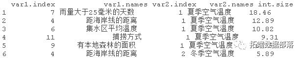 返回一个列表。前两个部分是对结果的总结,首先是5个最重要的交互作用的排名列表,其次是所有交互作用的表格。