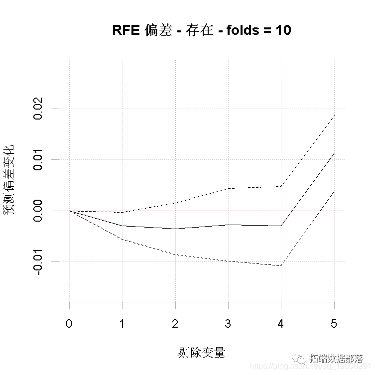 对于我们的运行,估计要剔除的最佳变量数是1;可以使用红色垂直线指示的数字。现在,建立一个剔除1个预测变量的模型,使用[[1]]表示我们要剔除一个变量。