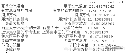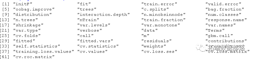 我们在每个交叉验证中计算每个统计量(在确定的最佳树数下,根据所有交叉验证中预测偏差的平均变化进行计算),然后在此呈现这些基于交叉验证的统计量的平均值和标准误差。weights - 拟合模型时使用的权重(默认情况下,每个观测值为 "1",即权重相等)。trees. fitted - 阶段性拟合过程中每一步所拟合的树的数量记录;training.loss.values - 训练数据上偏差的阶段性变化 ,cv.values - 阶段性过程中每一步所计算的预测偏差的CV估计值的平均值。