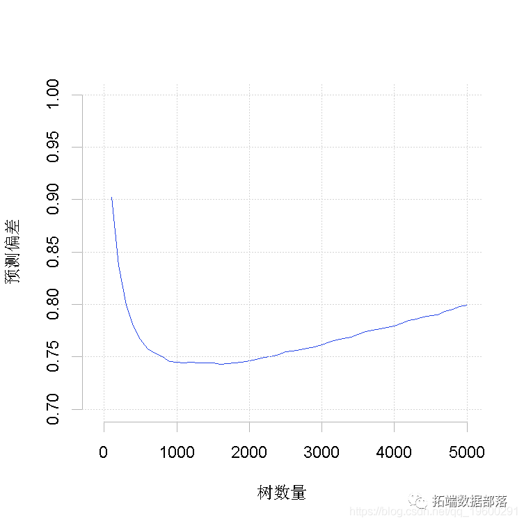 上面的代码会形成一个矩阵,每一列都是模型对tree.list中该元素所指定的树数量的预测,例如,第5列的预测是针对tree.list[5]=500棵树。现在来计算所有这些结果的偏差,然后绘制。