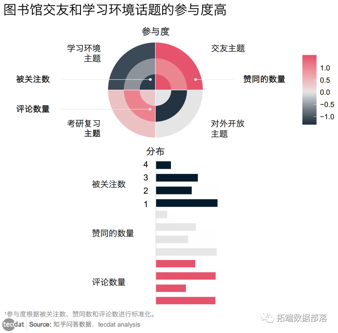 我们从评论数量、被关注度和赞同数量来评估用户的参与程度,可以看到图书馆交友话题(主题1)关注人数和赞同人数最多(如图书馆怎么认识女生?),其次是考研、复习(主题3)的相关话题(如图书馆应该为考研学生提供特权吗?),该话题下讨论的人数最多。接下来是学校图书馆对外开放(主题2)的话题(如公办大学的图书馆/自习室该不该对外开放?)和学习环境话题(主题4)(如本部图书馆内部环境设置怎么样,在同类高校中是属于很陈旧的还是很现代化的?)。