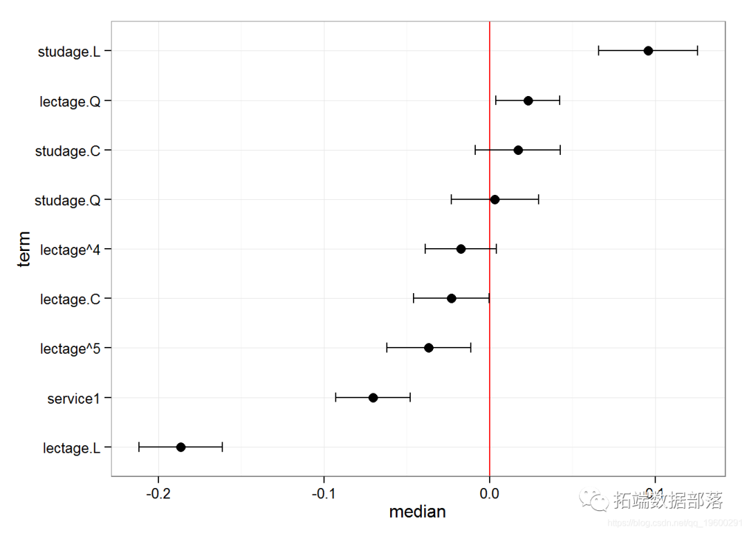 我们看到性别的随机影响确实不显着(P = 0.6792),外向的随机影响也很显着(P <.0001)。