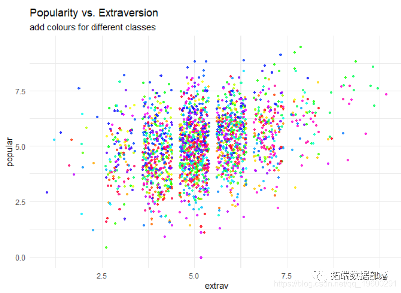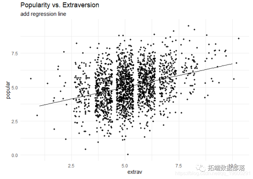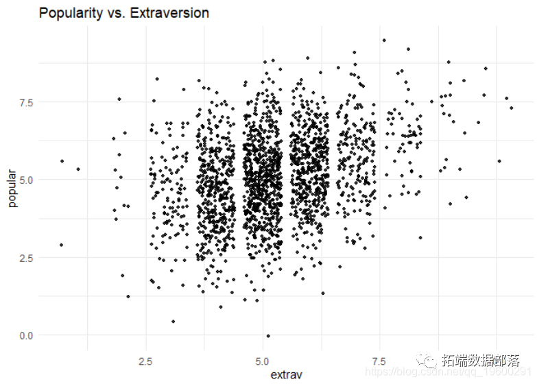 ggplot(data = populardata, aes(x = extrav, y = popular))+ geom_point(size = 1.2, alpha = .8, position = "jitter")+# 为绘图目的添加一些随机噪声 theme_minimal()