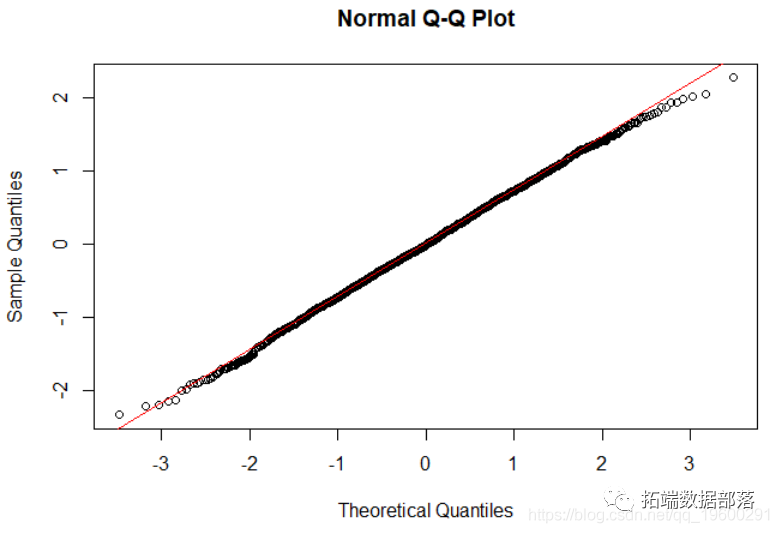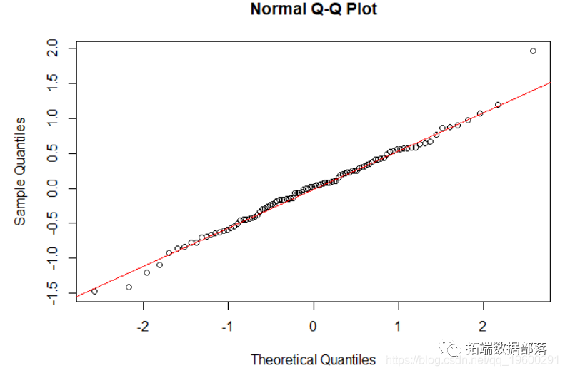 我们还可以使用QQ图检查残差的正态性。该图确实表明残差是正态分布的。