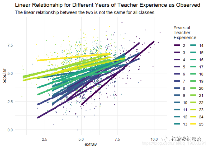 我们还可以清楚地看到,多年的教师经验既影响截距,又影响外向度的回归系数。