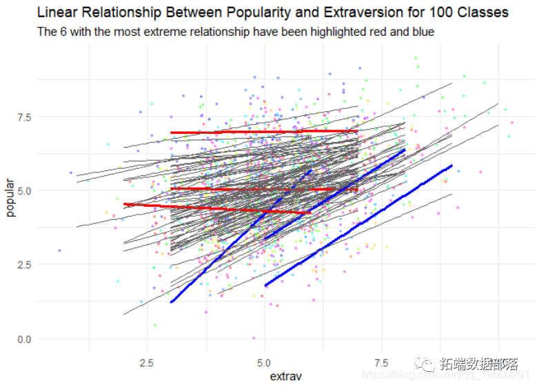 我们清楚地看到,外向性和受欢迎程度之间的关系在所有层级中并不相同,但平均而言,存在明显的正向关系。在本教程中,我们将显示这些不同斜率的估计值(以及如何解释这些差异)。