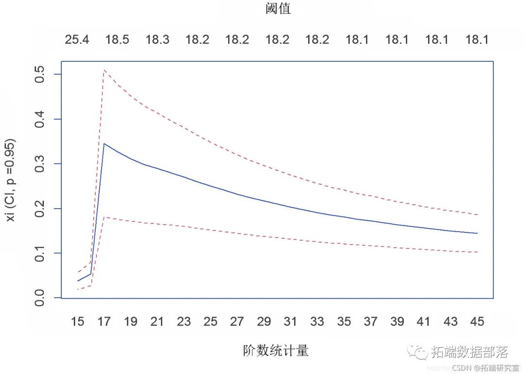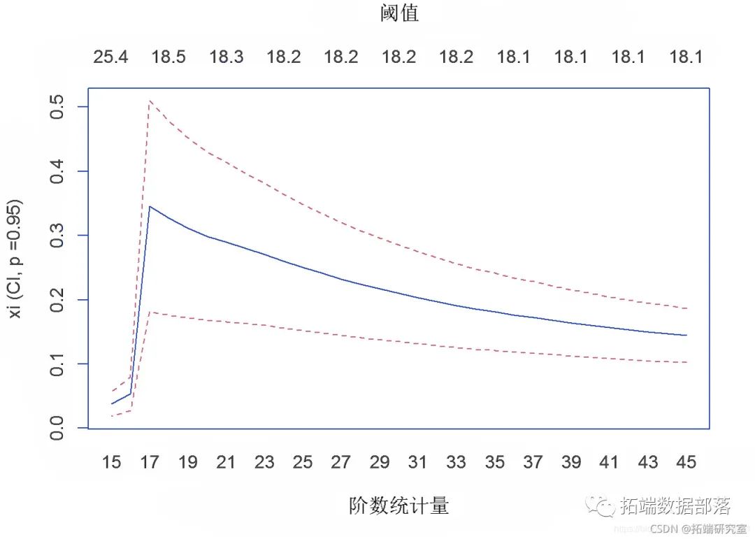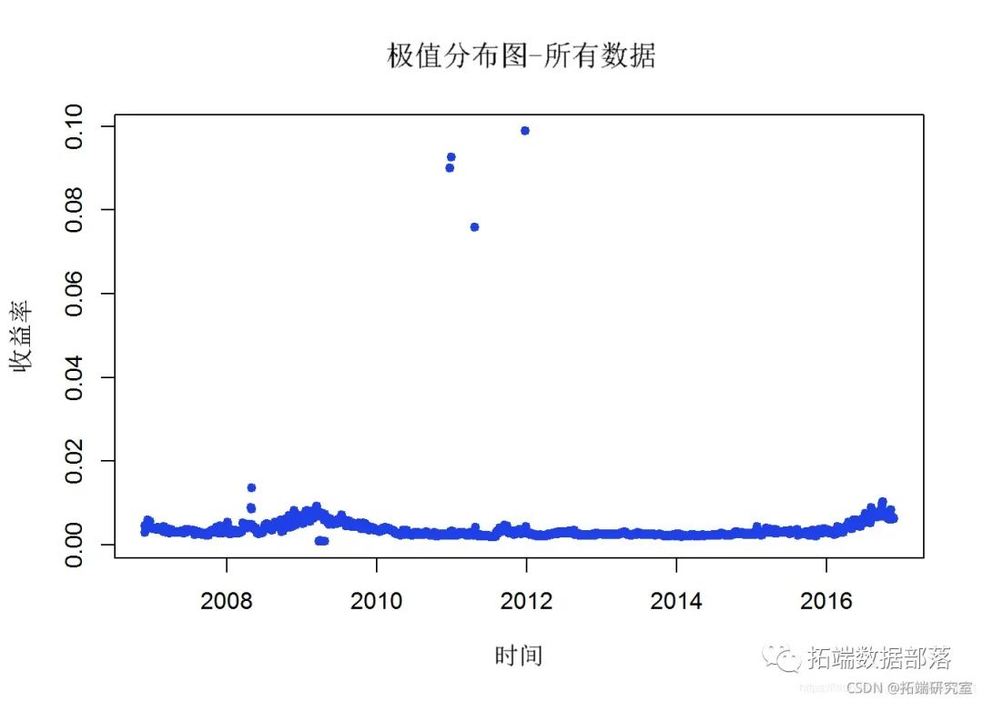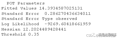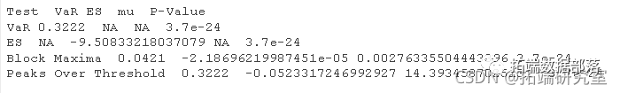 # 条件缩减是最差的0.95%缩减的平均值 ddGV <- xdrow(aEVts\[,2\]) # CvaR(预期亏损)估计值 CvaR(ts(alE), p=0.95, meho="miie")