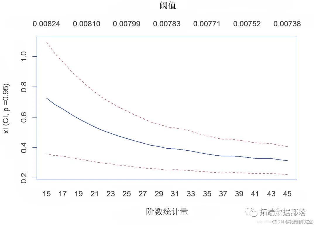 由于假设10股指数数据为重尾分布,数据极少变化,所以采用Hill Estimation对尾指数进行参数估计。目的是验证 10 只股票数据是否为极值分布。Hill Estimation 生成的图证实了。